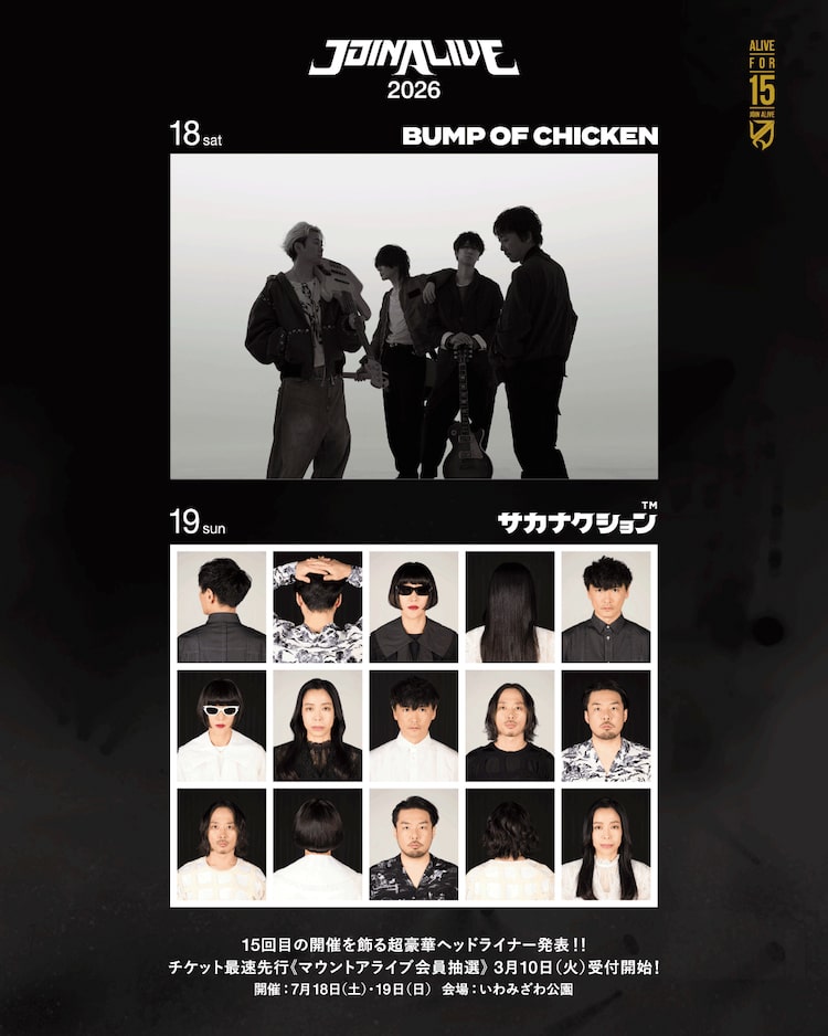 2010年に初開催され、今年で15回目となる「JOIN ALIVE」。このたび7月18日にはBUMP OF CHICKEN、19日にはサカナクションがヘッドライナーとして出演することが決まった。マウントアライブでは会員を対象に、3月10日にチケットの先行抽選予約の受付を開始する。